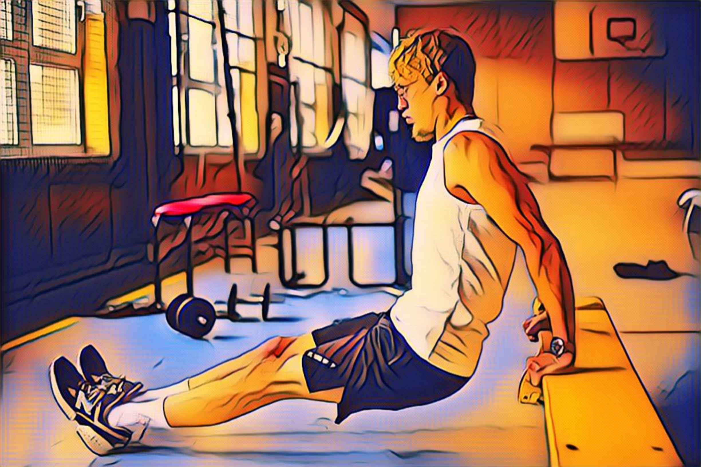 Stand between two parallel bars or use a very sturdy bench or chair doing bench dips.
